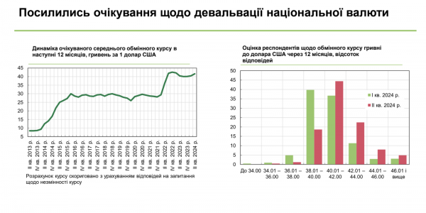 Середнє очікуване значення обмінного курсу через 12 місяців — 41.61 грн/дол. США (у І кварталі 2024 року — 40.44 грн/дол. США).