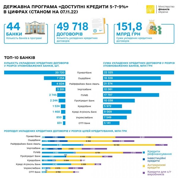 За період дії воєнного стану в Україні у межах державної програми «Доступні кредити 5−7−9%» укладено 14 896 кредитних договорів на загальну суму 62,15 млрд грн (у тому числі банками державного сектору — 11 549 кредитних договорів на суму 33,82 млрд грн), з яких: