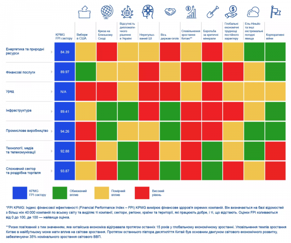 Команда експертів KPMG розробила карту впливу найвищих ризиків на окремі сектори економіки. Найбільшого впливу зазнає сектор енергетики та природних ресурсів. Серед причин — невизначеність на Близькому Сході та політизація доступу до мінералів і критичних ресурсів.