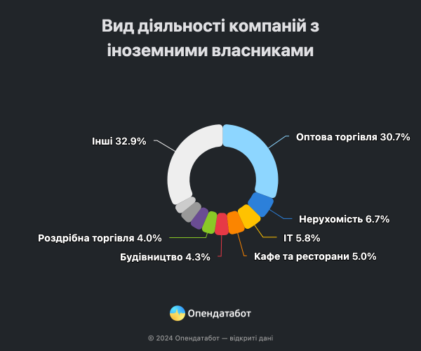 Найбільша кількість компаній з іноземними власниками займається оптовою торгівлею — 30,7%, операціями з нерухомим майном — 6,7% та комп'ютерним програмуванням — 5,8%.