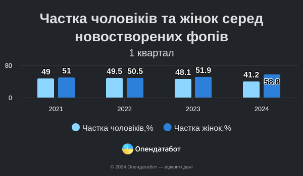 Водночас чоловіки відкрили 30 496 нових бізнесів за указаний період. Для порівняння, у 2021 році частка жінок становила 51% від загальної кількості новостворених ФОПів.