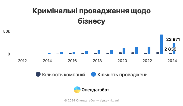 2023 рік став рекордним за кількістю відкритих кримінальних проваджень проти бізнесу — 43 138 справ. Це найбільший показник з 2012 року.