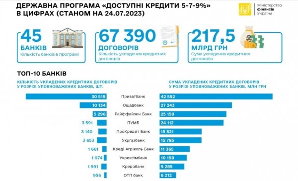 З моменту старту Державної програми «Доступні кредити 5−7−9%» суб'єкти підприємництва отримали від уповноважених банків 67 390 кредитів на загальну суму 217,5 млрд грн, з яких 45 380 — від банків державного сектору економіки на загальну суму 95,8 млрд гривень. Про це йдеться у повідомленні Міністерства фінансів.