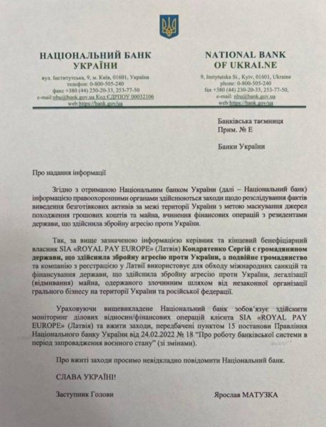 Ураховуючи вищевикладене Національний банк зобов’язує здійснити моніторинг ділових відносин/фінансових операцій клієнта SIA «ROYAL PAY EUROPE» (Латвія) та вжити заходи, передбачені пунктом 15 постанови Правління Національного банку України від 24.02.2022 №18 «Про роботу банківської системи в період запровадження воєнного стану» (зі змінами)”, – йдеться в документі.
