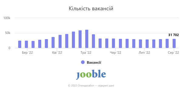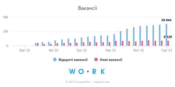 За даними Work.ua, кількість вакансій у липні сягла 38% від минулорічних показників. Попри це, кількість оголошень про пошук фахівців зросла на 14% за місяць та у 4 рази з моменту вторгнення РФ в Україну.