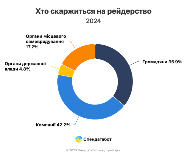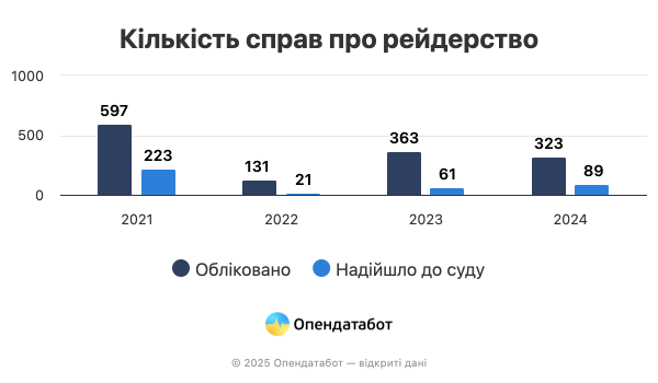 323 справи про рейдерство зафіксували торік — на 11% менше, ніж у 2023 році. Також це у 1,8 раза менше, ніж у 2021 році.