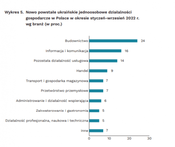 «Найбільший стрибок кількості індивідуальних підприємців-українців стався в перші тижні після початку російського вторгнення — у квітні 2022 року їх на польському ринку вже було в 4,5 разу більше, ніж у січні. У вересні — у 2,6 разу більше, ніж у квітні. У секторах переважали будівництво (24%), інформація та зв'язок (16%) та послуги (14%). Також варто зазначити, що 41% підприємців — жінки», — прокоментувала Ганна Шиманська, аналітик групи економічного прогнозування PIE.