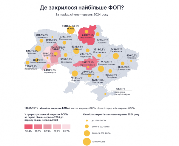За даними YouControl.Market, майже 92 тисячі ФОПів припинили діяльність в Україні за перше півріччя 2024 року. Це на 54% більше, ніж у першому півріччі 2023 року. Також на 15% зріс показник закриття компаній — за перше півріччя 2024 року припинили діяльність понад 1,5 тисячі підприємств.